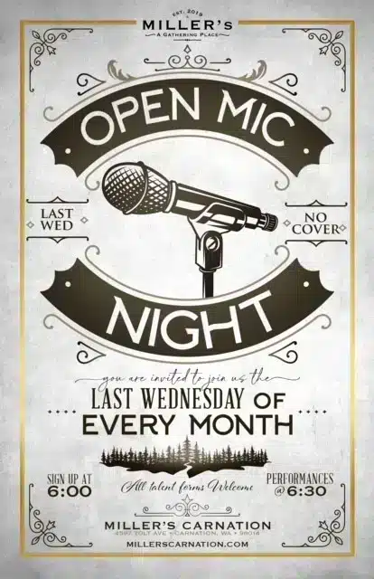 Millers - A Gathering Place 4597 Tolt Avenue, Carnation, WA, United StatesCome join us for Miller's Open Mic the last Wednesday of every month. Sign up starts at 6:00, first come. Performances start at 6:30. Two songs limit. All talent forms welcome. Looking forward to hearing what the valley has to offer! Two song limit. Please keep set-up minimal. Thank you! Beer, wine, and non-alcoholic beverages…