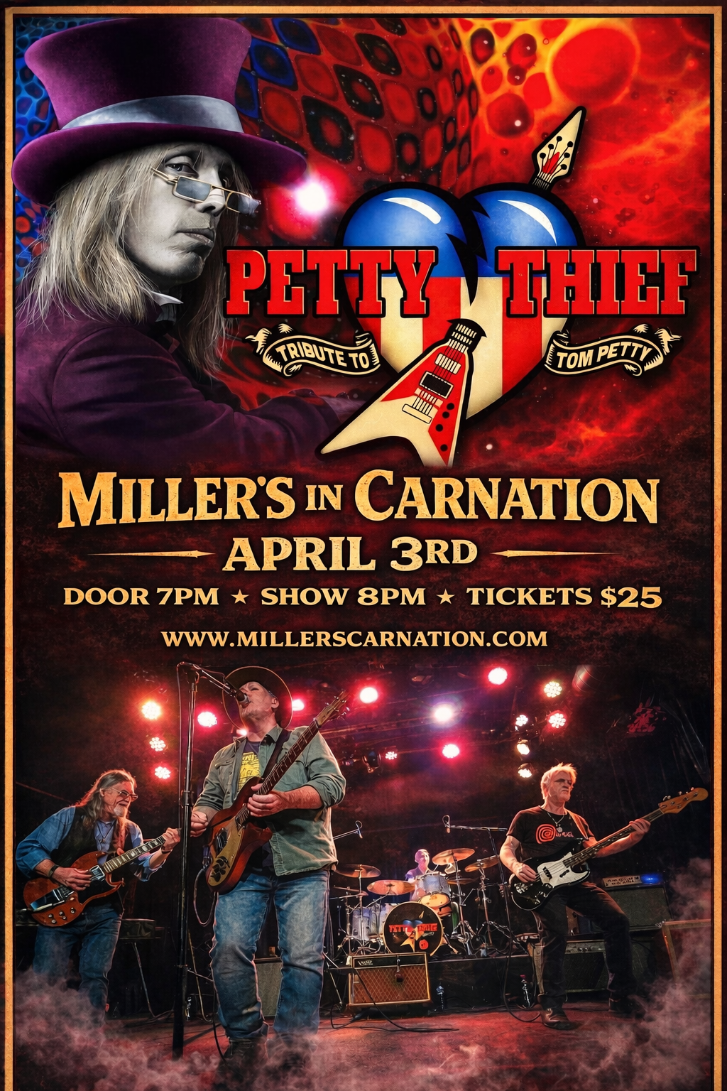 Millers - A Gathering Place 4597 Tolt Avenue, Carnation, WA, United StatesPetty Thief is a 5 piece, no frills rock and roll band, from the greater Seattle, WA area who meticulously encompass the Tom Petty sound and musically establish an emotional connection with the crowd that’s assembled. No wigs, no silly hats. Just 5 experienced musicians playing the great songs of a true Rock and Roll…