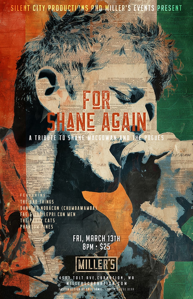 Millers - A Gathering Place 4597 Tolt Avenue, Carnation, WA, United StatesMiller’s Carnation and Silent City Productions Present For Shane Again, a tribute to Shane MacGowan & The Pogues. Originally hosted in 2014 by Seattle’s The Bad Things, the first For Shane was a raucous night of singing, dancing, and raising pints in honor of the legendary punk poet. Now, just in time for St. Patrick’s…