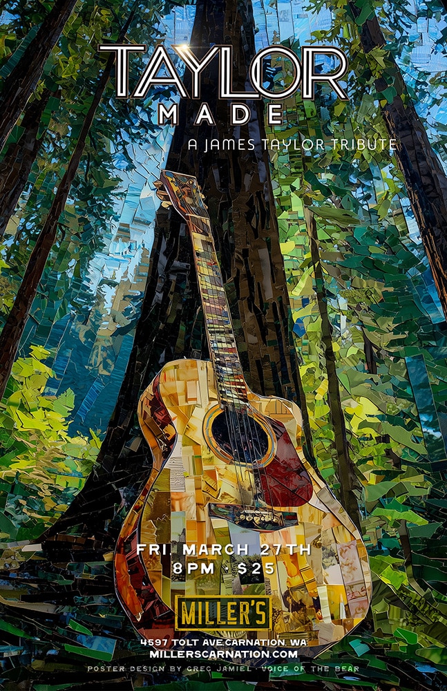 Millers - A Gathering Place 4597 Tolt Avenue, Carnation, WA, United StatesTaylor Made consists of seven of the northwest’s finest musicians. Performing all of James Taylor’s classic songs from his vast repertoire of twenty-two studio and live album releases from the 1970’s to the present. Faithfully recreating the magic of James’s classic hits like Fire And Rain, Handy Man, Carolina In My Mind, Country Road, Up On…